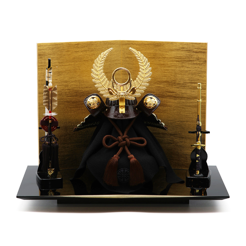 兜から小物まで全て国内の熟練職人の手で製作されたこだわりの品を選定しています。飾り台は静岡県で製作した黒塗りに金色の縁取りが印象的な飾り台、飾り台に合わせた屏風は光り輝く様な金色が美しい洋金箔屏風です。端午の節句らしい弓太刀は、黒塗りの伝統的な品を添えました。伝統的な組み合わせが日本らしく、趣深い印象を受ける飾りです。シンプルな組み合わせが兜の存在を際立せる品です。