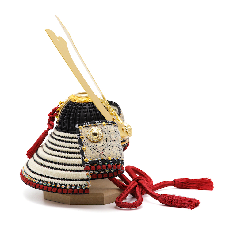 兜の両隣には端午の節句らしく、男らしい国産の弓太刀を添えています。白木を基調に弓部分のみに黒塗りを施した工房真の兜向けに製作したオリジナルの品です。