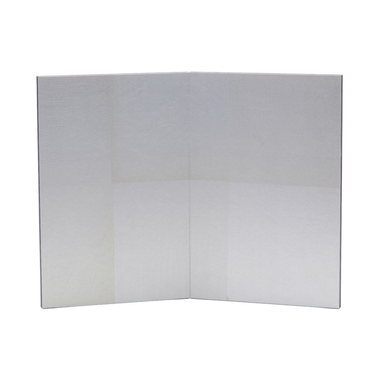 屏風は、現代的な銀色とごく薄い青の中間色のような光沢ある屏風。静岡県にて製作したこだわりの品で、天然繊維である生糸から作られた箔押し紙を利用し、一枚一枚手作業で配置していることから独特の美しさと屏風ごとの若干の個体差がございます。