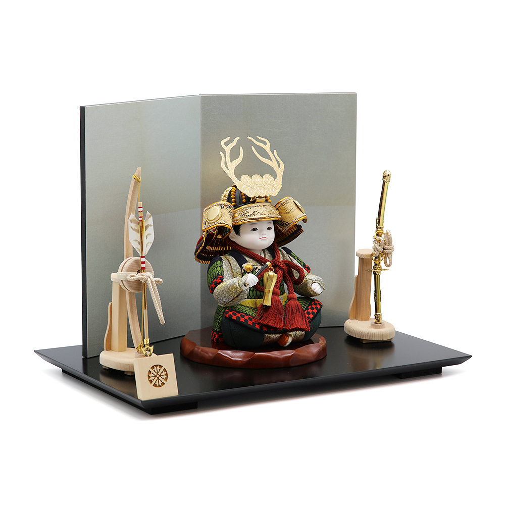 飾り台はシンプルな黒塗りの飾り台ですが、富山県高岡漆器の高岡塗りにて、敢えて艶(つや)をなくすことで、マットな質感を実現したお洒落な黒塗りの木製飾り台です。屏風は、現代的な銀色とごく薄い青の中間色のような光沢ある屏風。静岡県にて製作したこだわりの品です。武者人形の両隣には、端午の節句らしく、男らしい国産の弓太刀を添えています。爽やかでモダンな白木で製作した品です。飾り台、屏風、弓太刀のモダンな雰囲気から益々武者人形の豪華さが引き立つ逸品です。