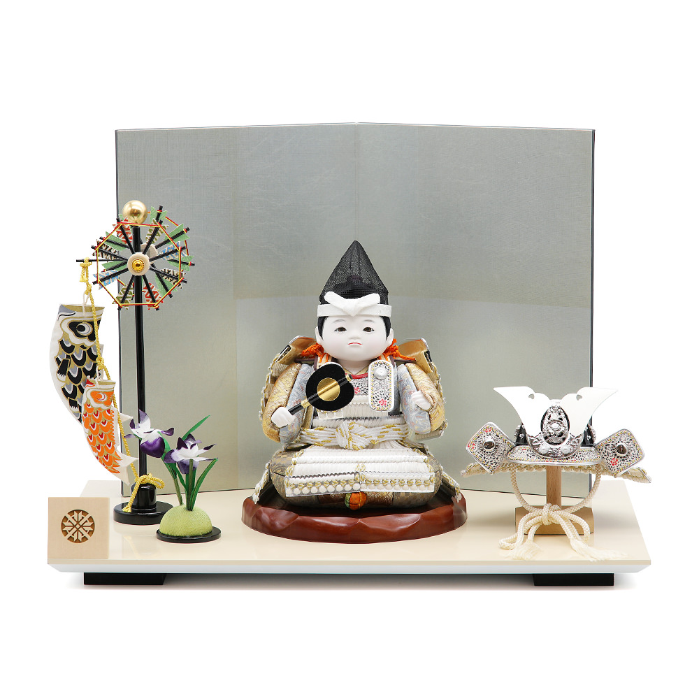 飾り台は高岡漆器の富山県高岡で製作した現代的な印象のある白塗りの飾り台。爽やかでモダンな印象を受けます。飾り台に合わせて屏風は、現代的な銀色とごく薄い青の中間色のような光沢ある屏風。静岡県にて製作したこだわりの品です。武者人形の両隣には、端午の節句らしくも可愛らしい鯉のぼりと菖蒲の花を添えています。爽やかでモダンな雰囲気、男の子らしさ、可愛らしさを感じる大変魅力的な武者人形飾りです。