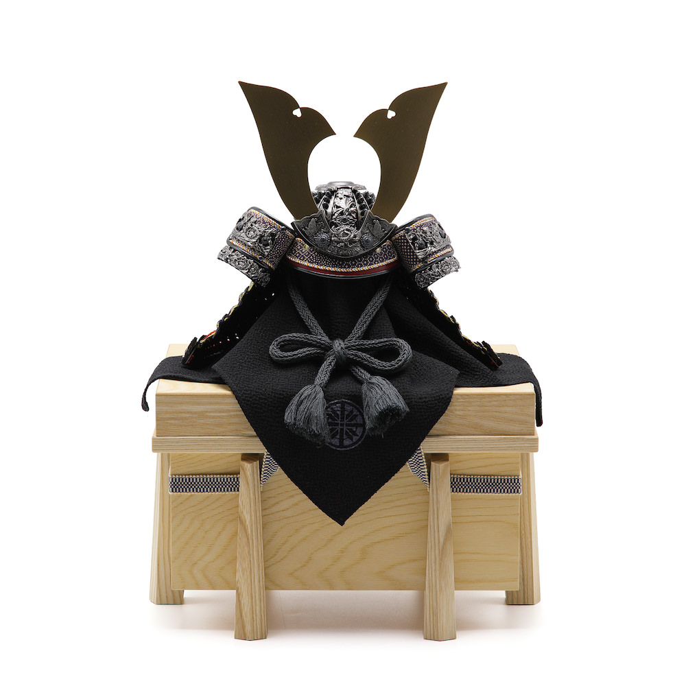 黒を基調にした工房真オリジナルの男らしい兜飾りです。大きな鍬形の威厳と存在感溢れる姿は逞しく育ってほしいと願いを込める兜飾りに相応しいものです。栓の木で製作したナチュラルなお色の木製のお櫃に兜をセットしました。兜はお櫃の中に収納することが可能となるため、洗練されたスタイリッシュさと機能性を兼ね備えています。