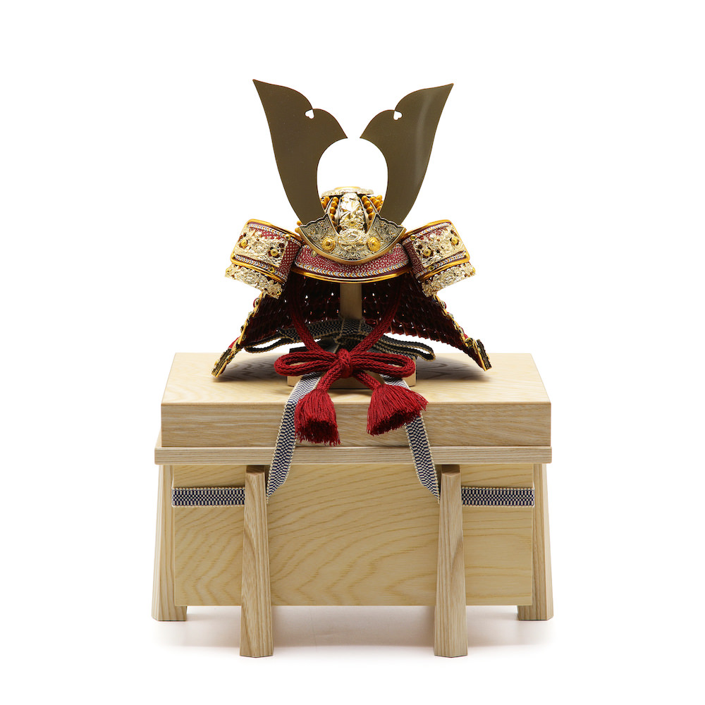 現代の住宅にも飾りやすく工房で企画したオリジナルの栓木櫃は木目のあたたかみとナチュラルな白木の雰囲気が特徴的な木製の品。シンプルながら兜飾りの存在感が際立つこだわりの逸品です。