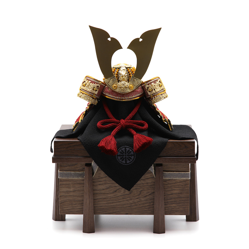 赤色の威に大きな鍬形の兜は伝統的かつシンプルな印象の工房真オリジナルの男らしい兜飾りです。大きな鍬形の威厳と存在感溢れる姿は逞しく育ってほしいと願いを込める兜飾りに相応しいものです。重厚感のあるウォルナットのような濃茶木目の櫃にセットした飾りです。兜はお櫃の中に収納することが可能となるため、洗練されたスタイリッシュさと機能性を兼ね備えています。