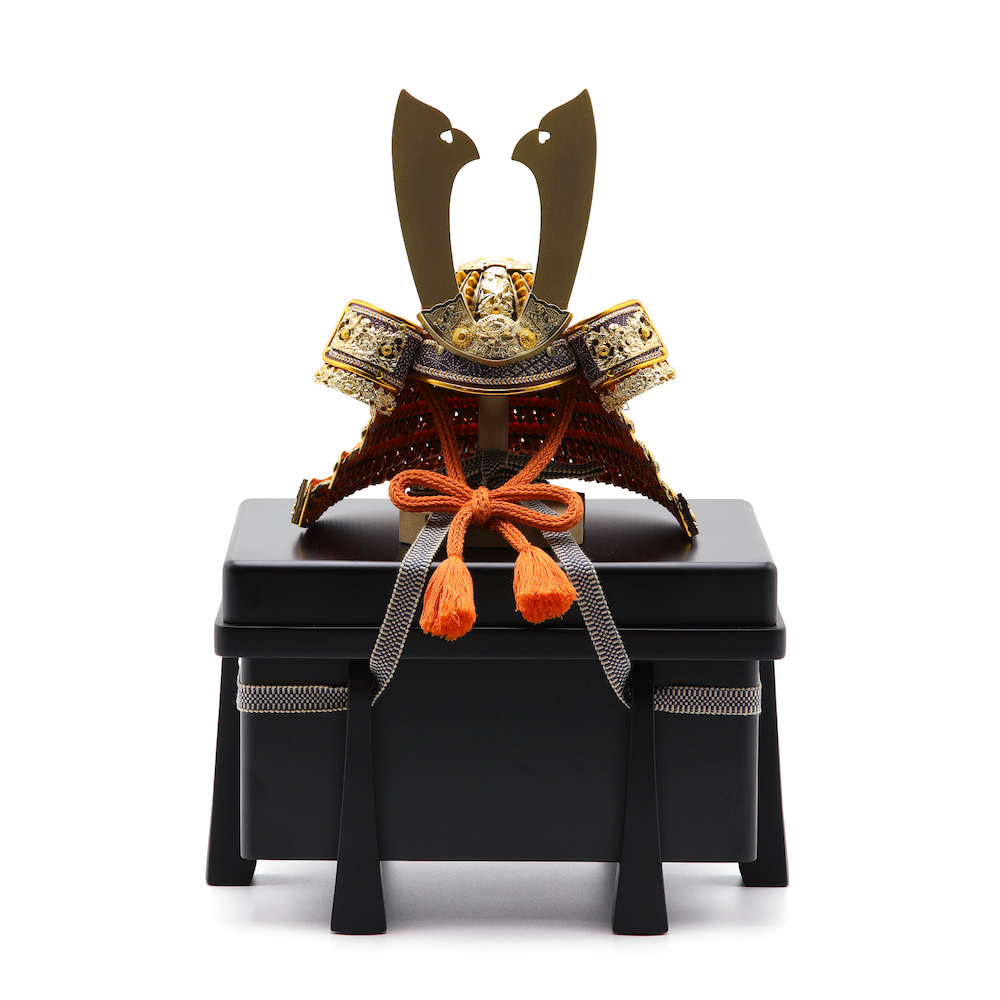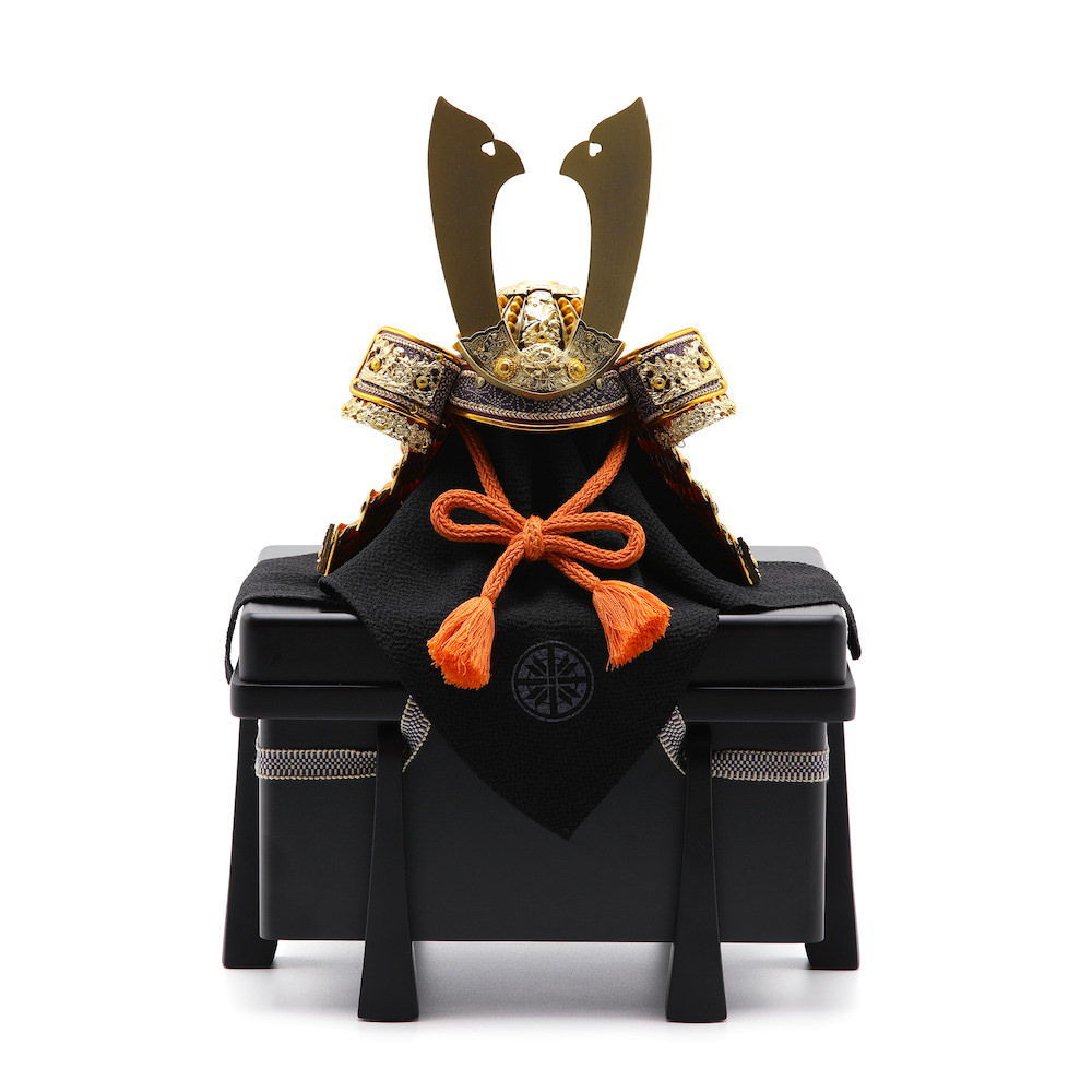 橙色を基調にした明るい威、吹返や鍬形台の鮮やかな金色が大変豪華な印象の兜です。大きな鍬形の威厳と存在感溢れる姿は逞しく育ってほしいと願いを込める兜飾りに相応しいものです。シンプルな黒塗りの櫃にセットしました。黒塗りは敢えて艶を少なめにしたマットな質感がお洒落な品です。兜はお櫃の中に収納することが可能となるため、洗練されたスタイリッシュさと機能性を兼ね備えています。