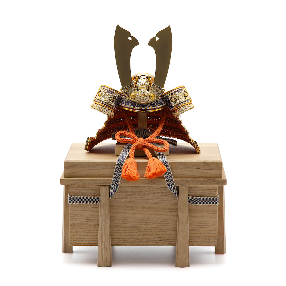 橙色を基調にした明るい威、吹返や鍬形台の鮮やかな金色が大変豪華な印象の兜です。大きな鍬形の威厳と存在感溢れる姿は逞しく育ってほしいと願いを込める兜飾りに相応しいものです。シンプルな木目の櫃にセットした飾りです。兜はお櫃の中に収納することが可能となるため、洗練されたスタイリッシュさと機能性を兼ね備えています。