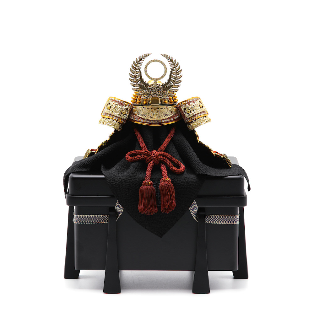 現代の住宅にも飾りやすく工房で企画したオリジナルの黒櫃は光沢を可能な限りなくし、マットな落ち着いた雰囲気が特徴的な木製の品。シンプルながら兜飾りの存在感が際立つこだわりの逸品です。