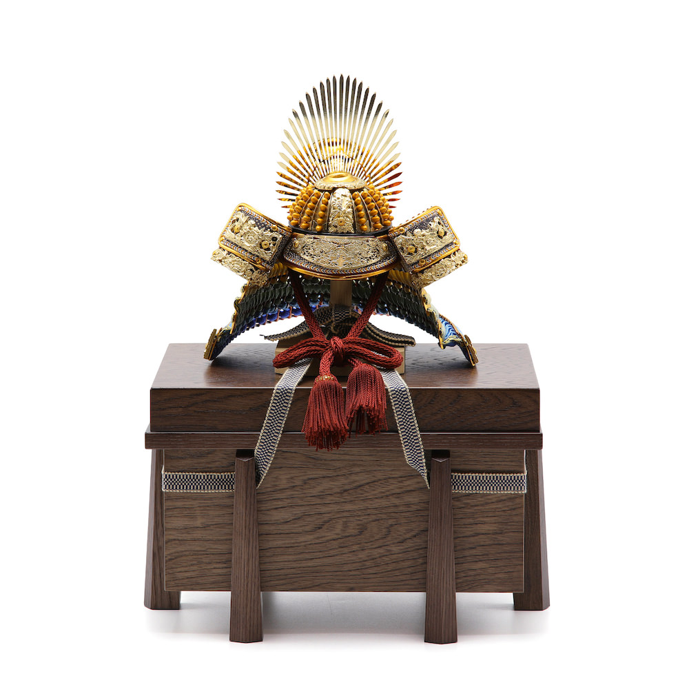 現代の住宅にも飾りやすく工房で企画したオリジナルの木製の櫃は木目のあたたかみとウォルナットの様な高級感と重厚感ある雰囲気が特徴的な木製の品。シンプルながら兜飾りの存在感が際立つこだわりの逸品です。