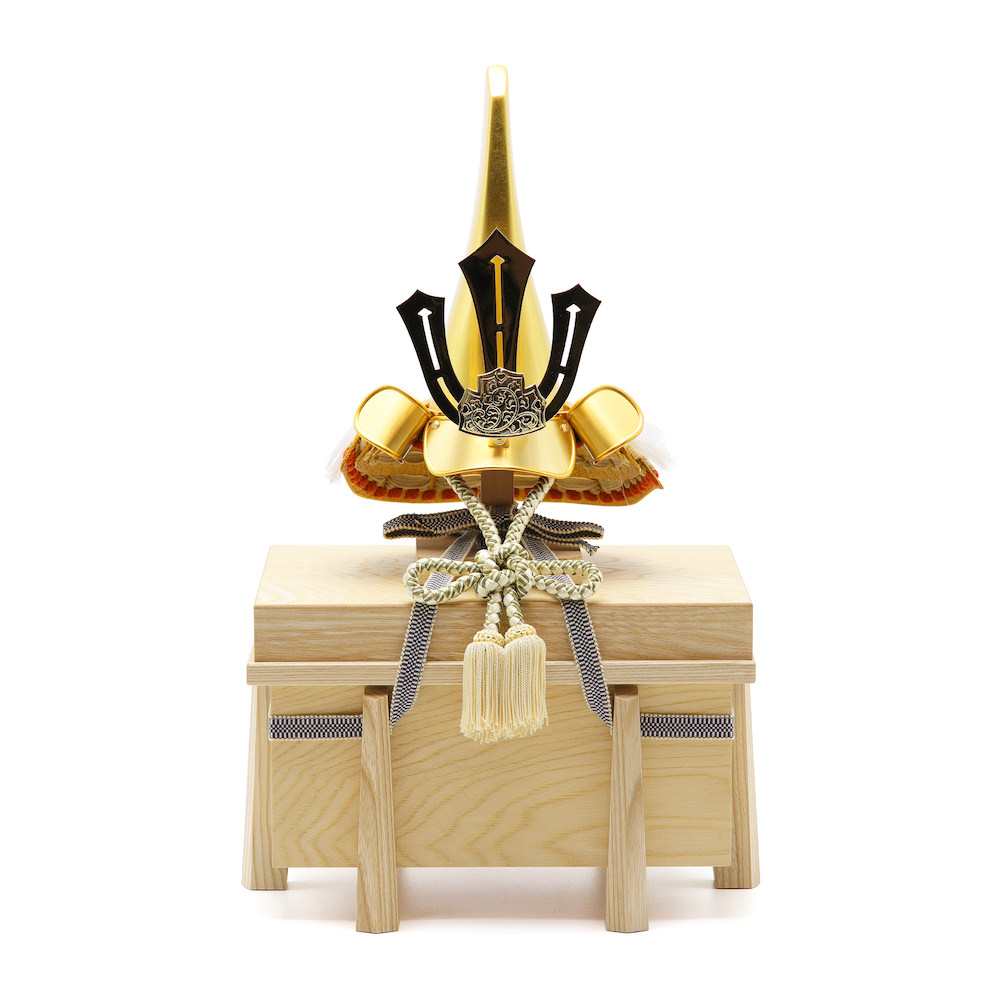 筒のような特徴的な兜は前田利家の兜を忠実に再現しています。男らしく、個性的な雰囲気のある兜飾りです。日本の職人の技術をふんだんに織り交ぜた確かな品質のコンパクトで飾りやすいサイズの豪華な兜飾りに仕上がっています。栓の木で製作したナチュラルなお色の木製のお櫃に兜をセットしました。兜はお櫃の中に収納することが可能となるため、洗練されたスタイリッシュさと機能性を兼ね備えています。