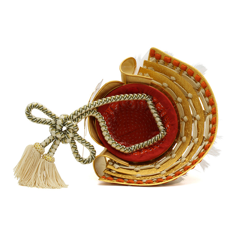 筒のような特徴的な兜は前田利家の兜を忠実に再現しています。男らしく、個性的な雰囲気のある兜飾りです。日本の職人の技術をふんだんに織り交ぜた確かな品質のコンパクトで飾りやすいサイズの豪華な兜飾りに仕上がっています。重厚感のあるウォルナットのような濃茶木目の櫃にセットした飾りです。兜はお櫃の中に収納することが可能となるため、洗練されたスタイリッシュさと機能性を兼ね備えています。