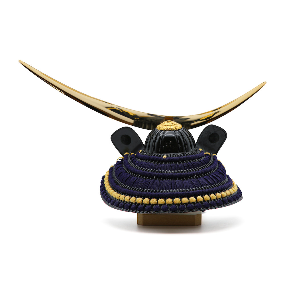 兜の大きさは8号、兜鉢は艶有りのタイプとなり、威の色は濃紺色、差し色で耳糸には黄色を入れています。現代のご自宅にも飾りやすいようコンパクトに工房真が国内の熟練職人と製作した逸品です。