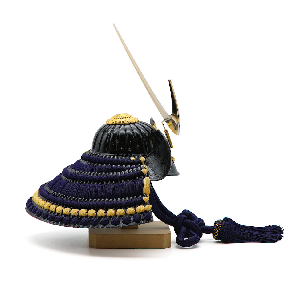 兜の大きさは8号、兜鉢は艶有りのタイプとなり、威の色は濃紺色、差し色で耳糸には黄色を入れています。現代のご自宅にも飾りやすいようコンパクトに工房真が国内の熟練職人と製作した逸品です。