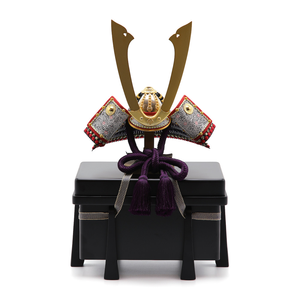迫力ある大きな鍬形に紫裾濃の色鮮やかな威が特徴的な兜です。色鮮やかな威のお色が目を引く品ですが、伝統的な製法でしっかりと製作されています。シンプルな黒塗りの櫃にセットしました。黒塗りは敢えて艶を少なめにしたマットな質感がお洒落な品です。兜はお櫃の中に収納することが可能となるため、洗練されたスタイリッシュさと機能性を兼ね備えています。