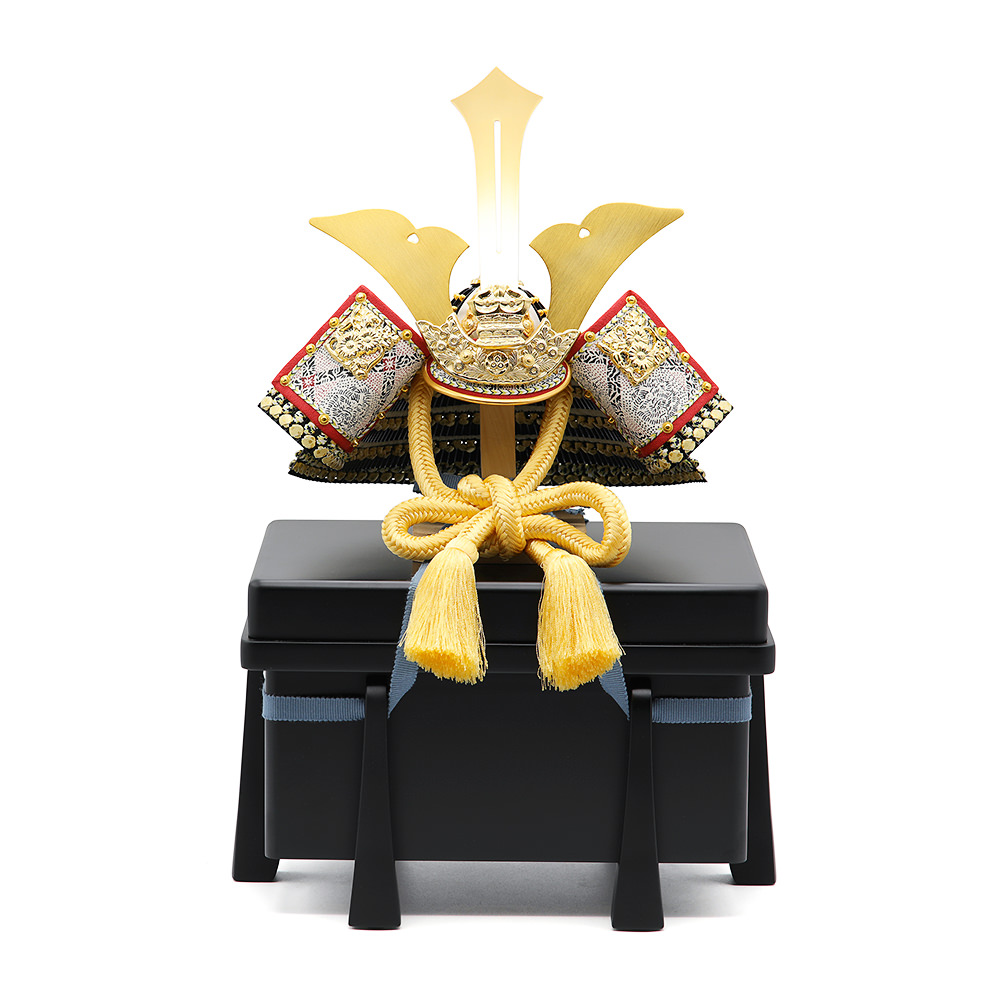 現代の住宅にも飾りやすく工房で企画したオリジナルの黒櫃は光沢を可能な限りなくし、マットな落ち着いた雰囲気が特徴的な木製の品。シンプルながら兜飾りの存在感が際立つこだわりの逸品です。