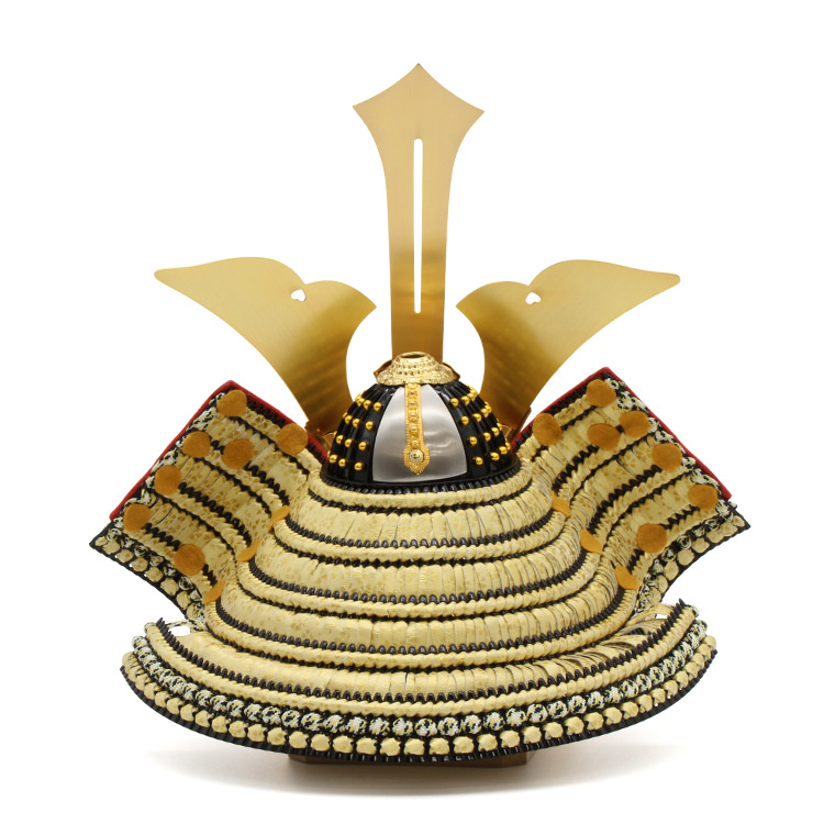 工房真にて兜職人と製作をした特徴的な三本の鍬形に桜の花びら模様をあしらった革を用いた威(おどし)が豪華なこだわりの兜飾りです。桜の花びら模様をあしらった柄は小桜と言います。細かな花びらが舞い散るような儚げで美しい小桜の兜は、日本らしさを感じさせてくれる逸品です。日本の職人の高い技術で本物の兜のように細部にまでリアリティを追求した本格的な手づくり品です。