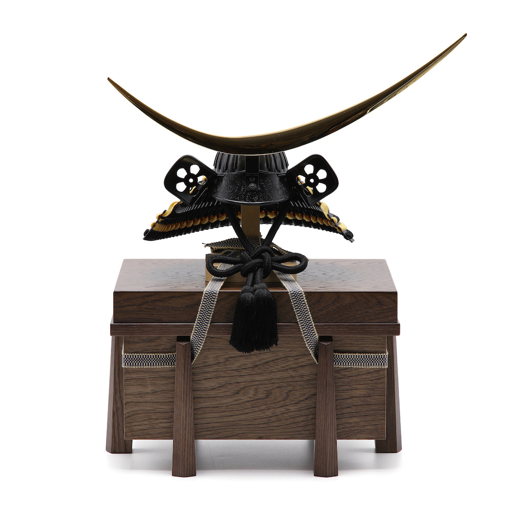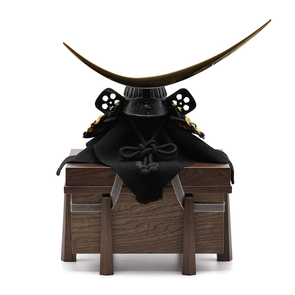 三日月型の鍬形が大変存在感のある伊達政宗の兜飾りです。艶無しの黒で統一された兜はシンプルだからこそ、洗練された印象を受けます。重厚感のあるウォルナットのような濃茶木目の櫃にセットした飾りです。兜はお櫃の中に収納することが可能となるため、洗練されたスタイリッシュさと機能性を兼ね備えています。