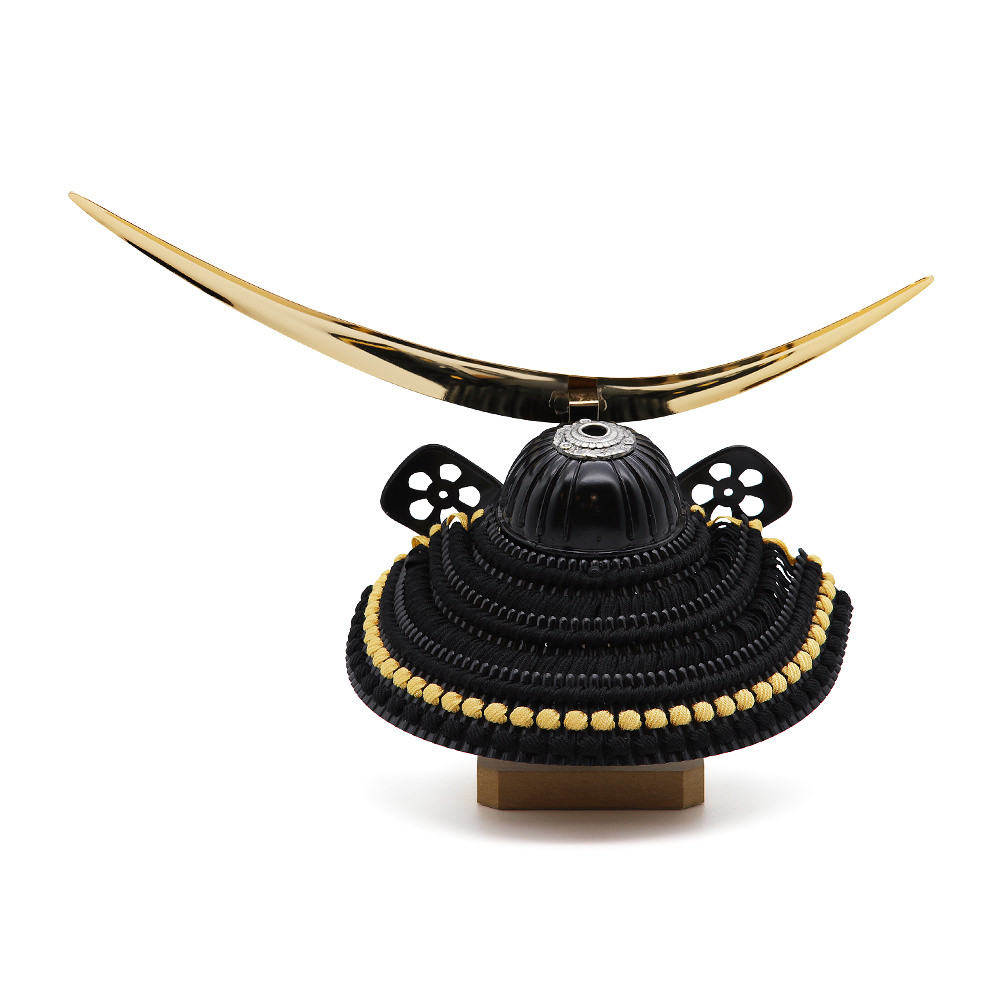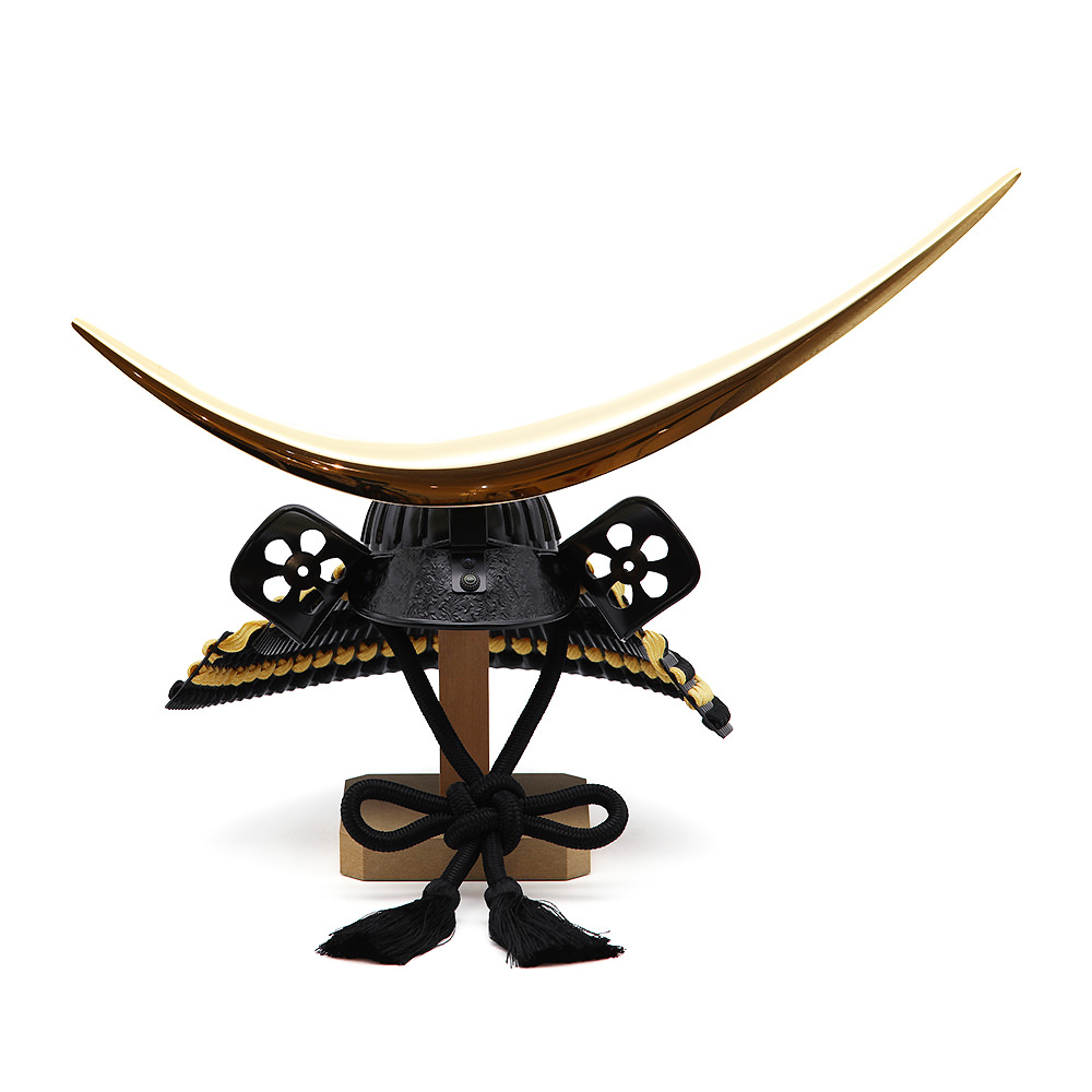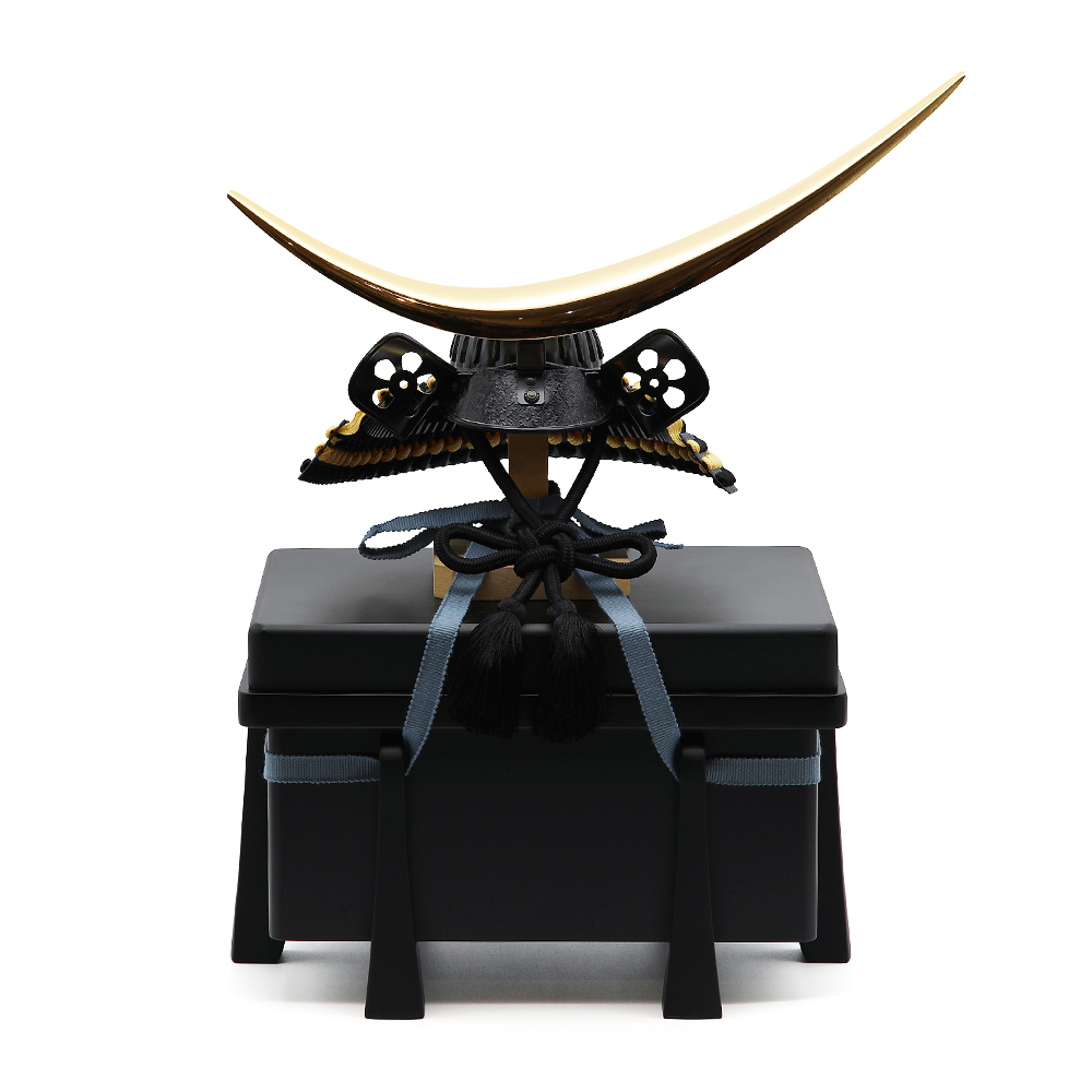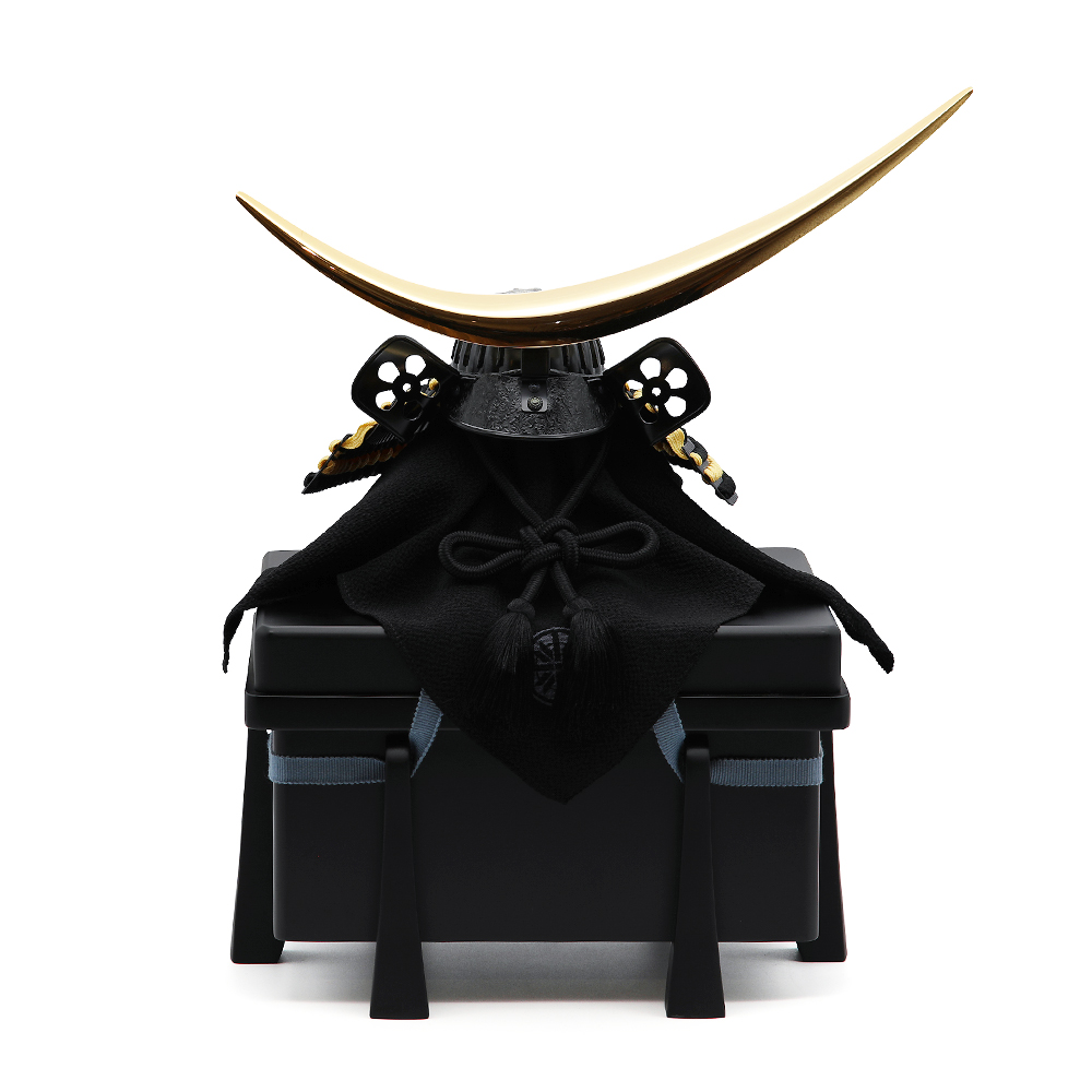 三日月型の鍬形が大変存在感のある伊達政宗の兜飾りです。艶無しの黒で統一された兜はシンプルだからこそ、洗練された印象を受けます。シンプルな黒塗りの櫃にセットしました。黒塗りは敢えて艶を少なめにしたマットな質感がお洒落な品です。兜はお櫃の中に収納することが可能となるため、洗練されたスタイリッシュさと機能性を兼ね備えています。