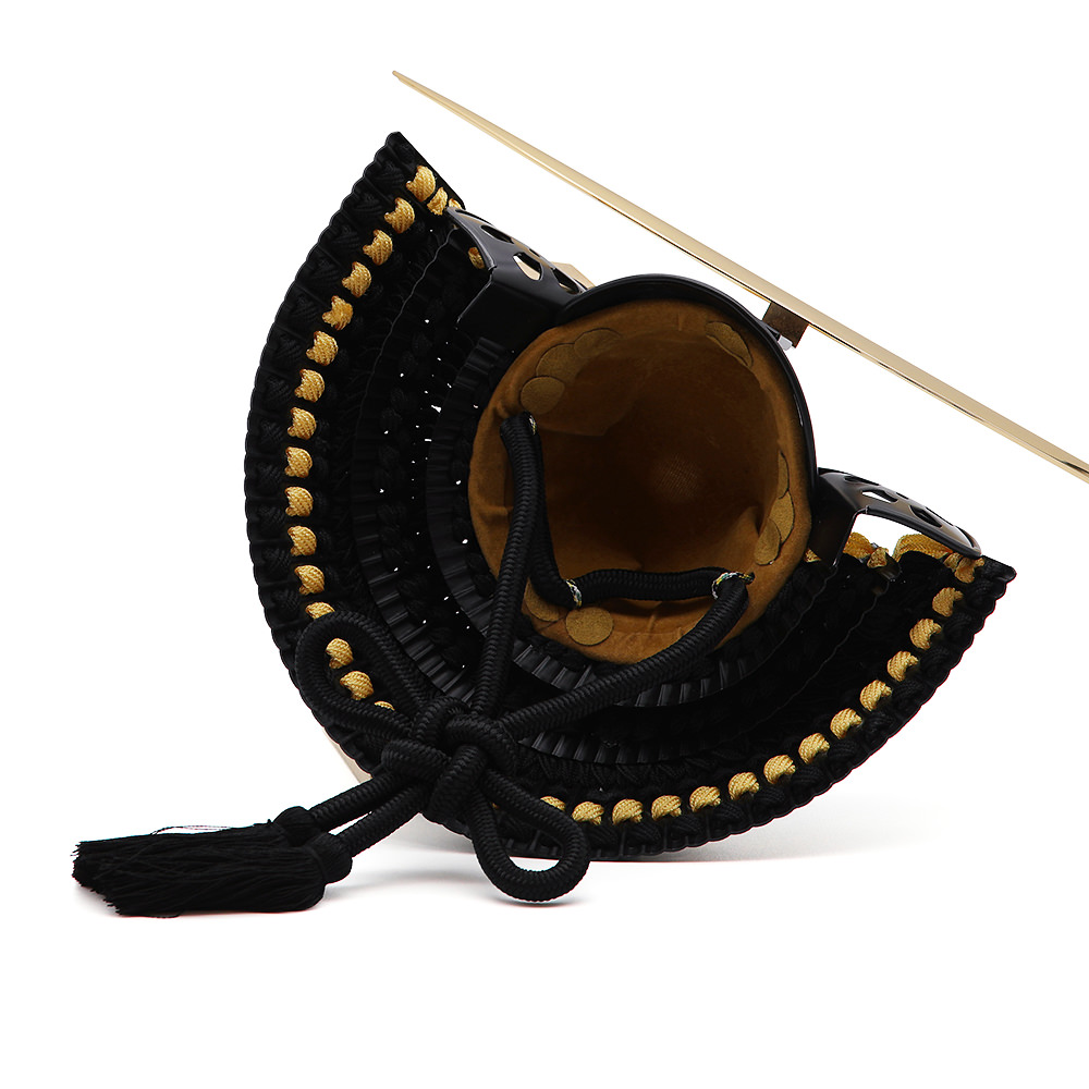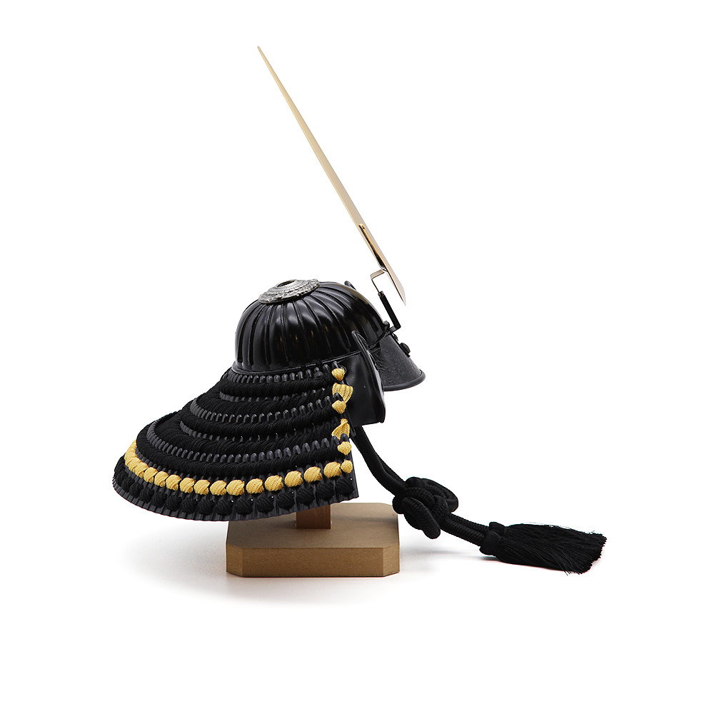 伊達政宗公の兜を忠実に再現した兜飾りは、末長くお飾りいただける逸品です。伊達政宗の独眼竜の呼び名にふさわしく、逞しい印象の特徴的な鍬形に黒をベースにした兜飾りは存在感が大変大きいです。兜の大きさは8号、兜鉢は艶無しのタイプとなり、兜の鉢、威、忍の緒まで黒一色で統一し、耳糸のみ黄色の差し色を入れています。現代のご自宅にも飾りやすいようコンパクトに工房真が国内の熟練職人と製作した逸品です。