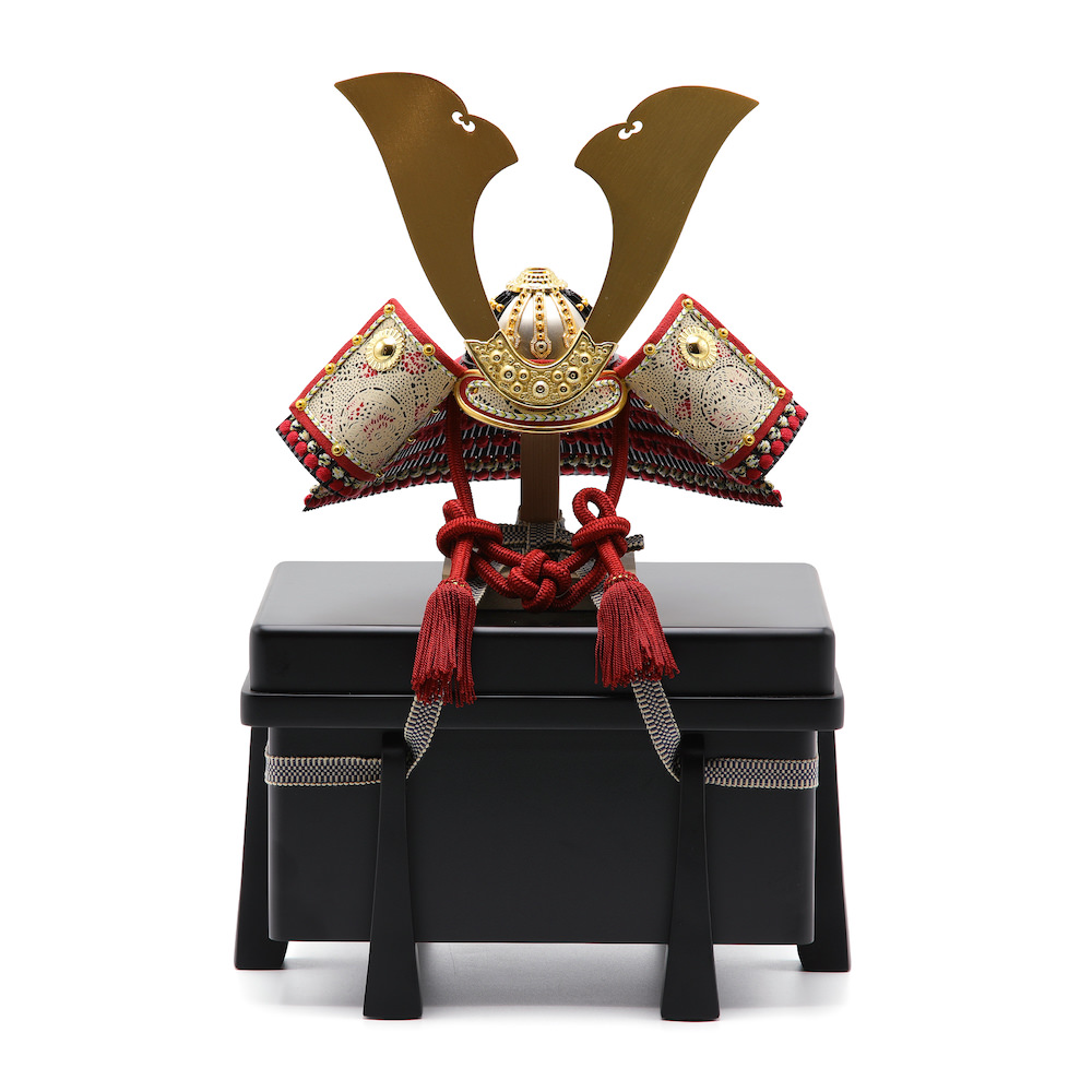 伝統的な赤い威が存在感のある豪華な兜飾りです。シンプルな黒塗りの櫃にセットしました。黒塗りは敢えて艶を少なめにしたマットな質感がお洒落な品です。兜はお櫃の中に収納することが可能となるため、洗練されたスタイリッシュさと機能性を兼ね備えています。