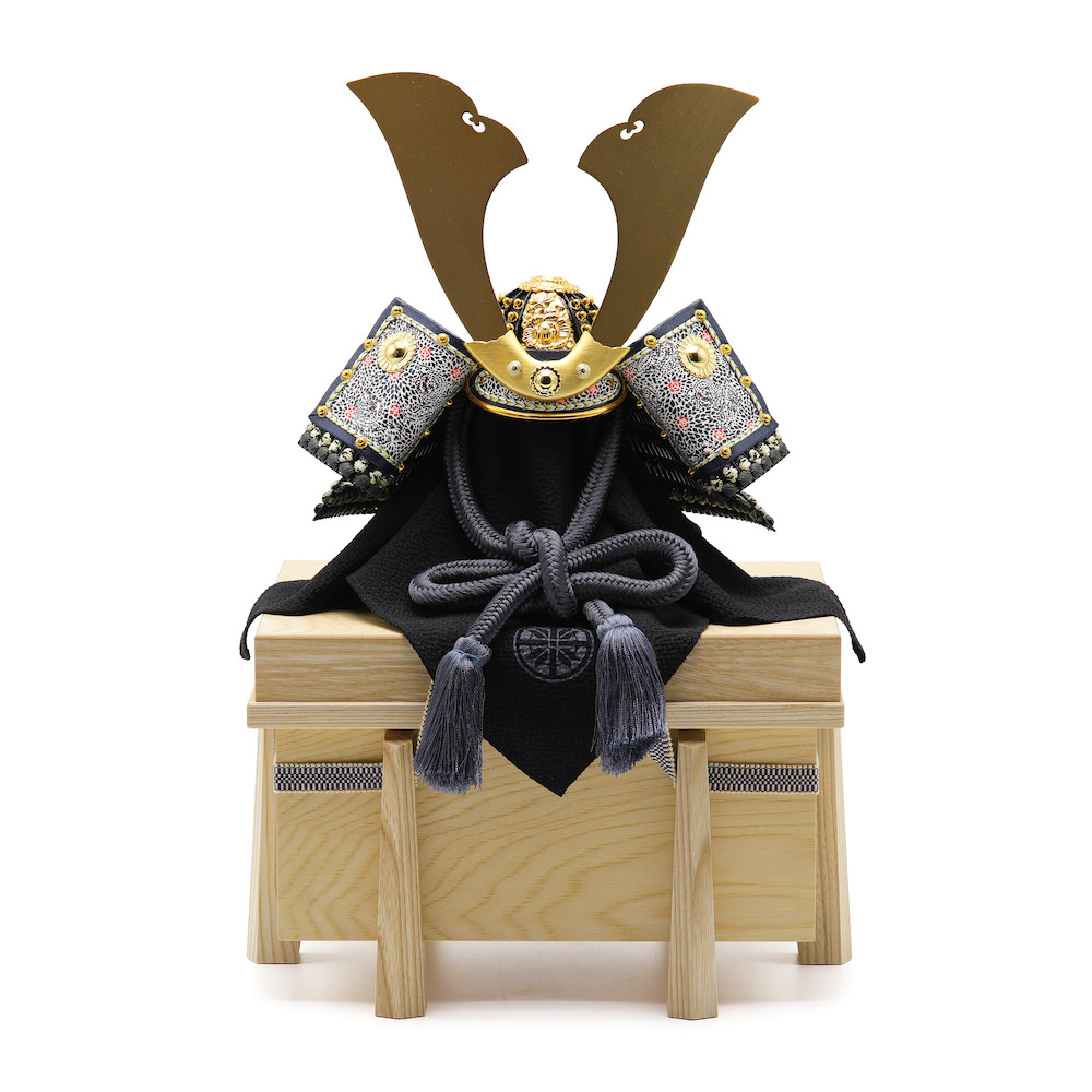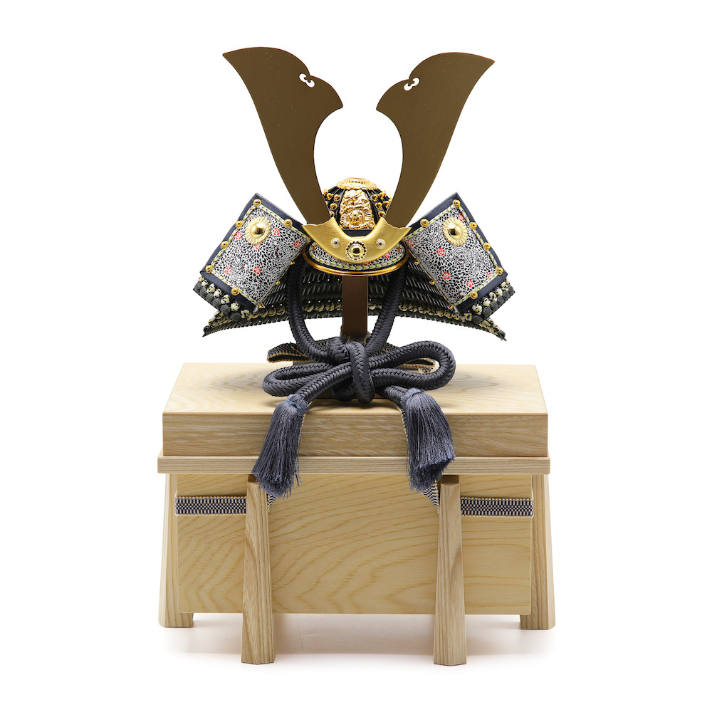 現代的な印象の濃灰色の威、紺色の忍緒が新鮮な大鍬兜。栓の木で製作したナチュラルなお色の木製のお櫃に兜をセットしました。兜はお櫃の中に収納することが可能となるため、洗練されたスタイリッシュさと機能性を兼ね備えています。