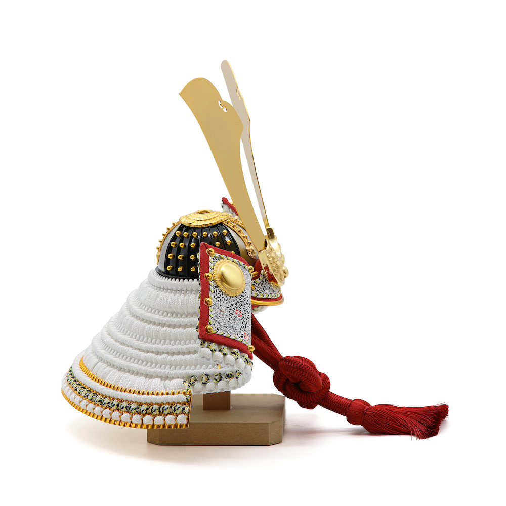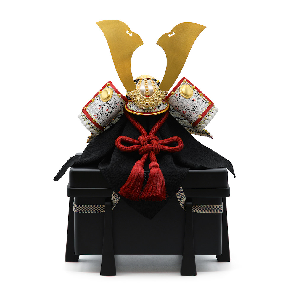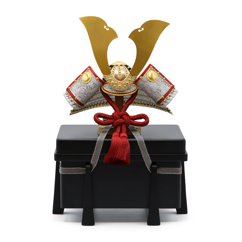 爽やかで豪華な印象の白い兜。鍬形の金色や吹返の赤色が刺し色の大変存在感のある兜です。シンプルな黒塗りの櫃にセットしました。黒塗りは敢えて艶を少なめにしたマットな質感がお洒落な品です。兜はお櫃の中に収納することが可能となるため、洗練されたスタイリッシュさと機能性を兼ね備えています。