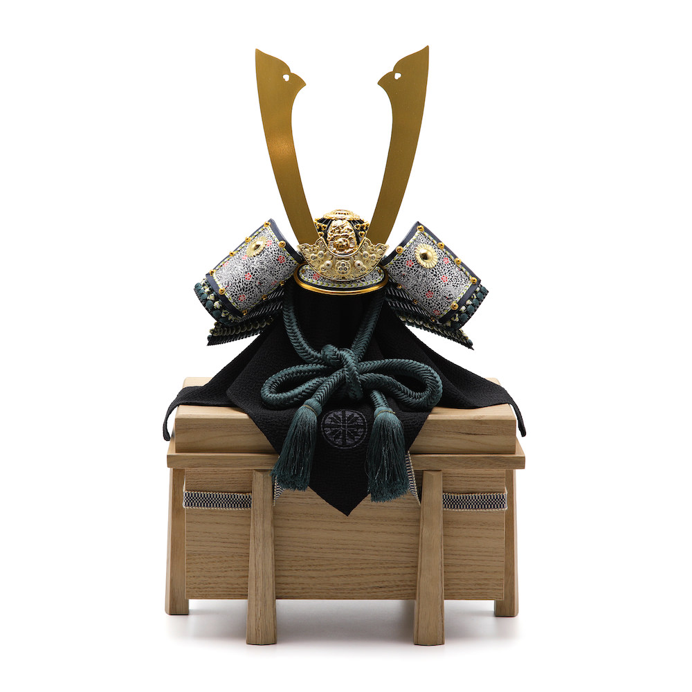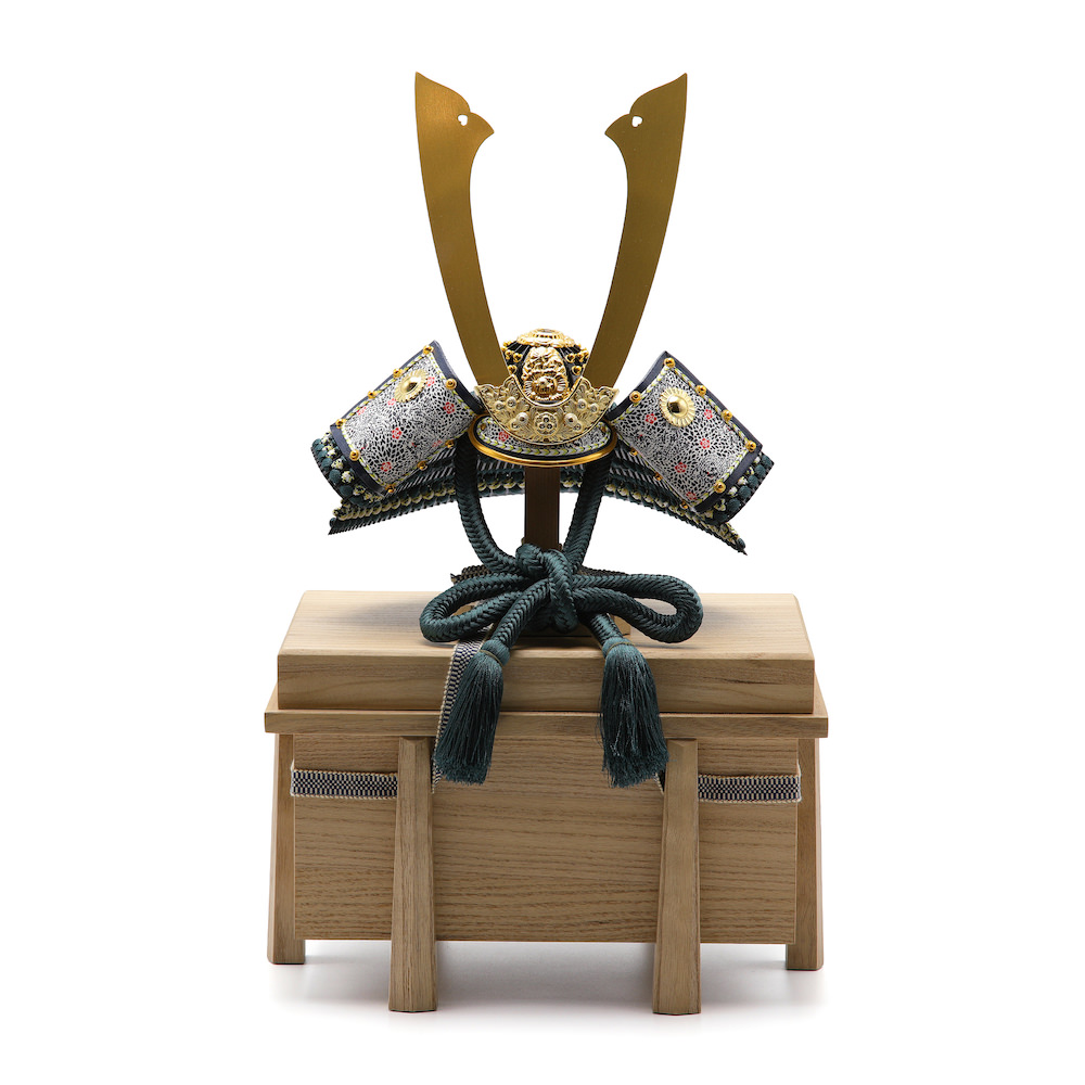 少々くすんだ濃緑色の威、大きな長鍬の兜は大変現代的でお洒落な印象の兜です。シンプルな木目の櫃にセットした飾りです。兜はお櫃の中に収納することが可能となるため、洗練されたスタイリッシュさと機能性を兼ね備えています。