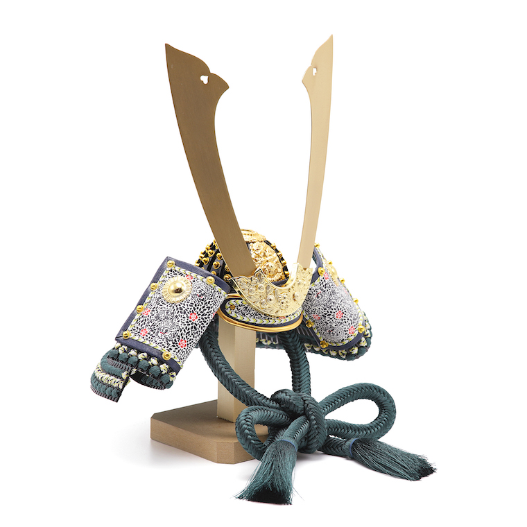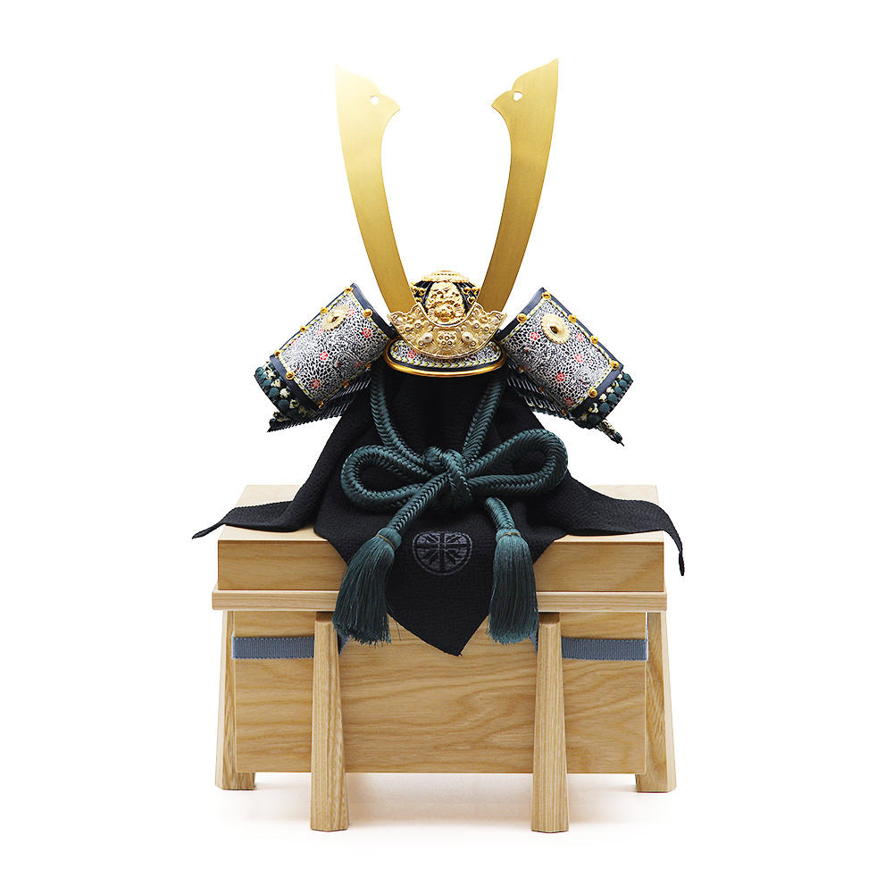 現代の住宅にも飾りやすく工房で企画したオリジナルの栓木櫃は木目のあたたかみとナチュラルな白木の雰囲気が特徴的な木製の品。シンプルながら兜飾りの存在感が際立つこだわりの逸品です。兜の芯木を櫃に縛る真田紐は日本の古来からの色である縹色(はなだいろ)。真田紐の縹色が大変お洒落な差し色になっています。