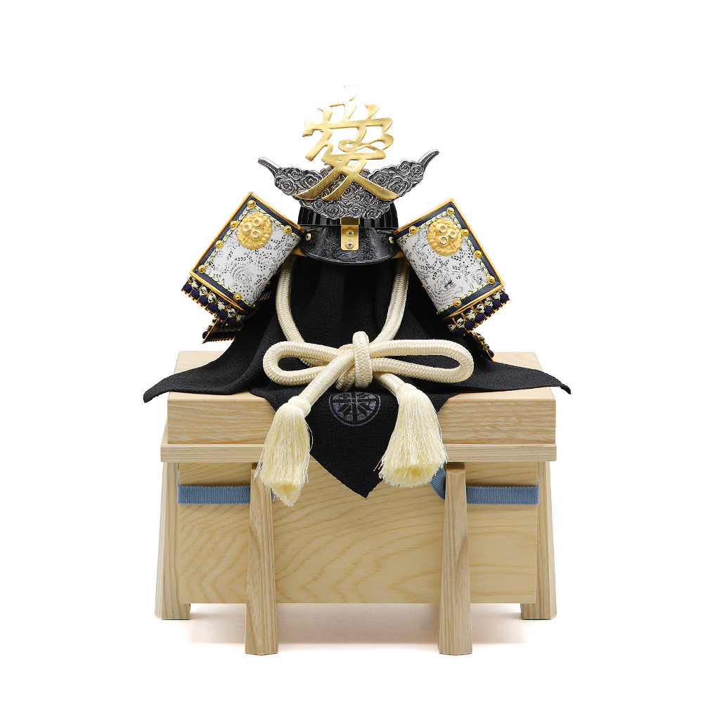 現代の住宅にも飾りやすく工房で企画したオリジナルの栓木櫃は木目のあたたかみとナチュラルな白木の雰囲気が特徴的な木製の品。シンプルながら兜飾りの存在感が際立つこだわりの逸品です。兜の芯木を櫃に縛る真田紐は日本の古来からの色である縹色(はなだいろ)。真田紐の縹色が大変お洒落な差し色になっています。