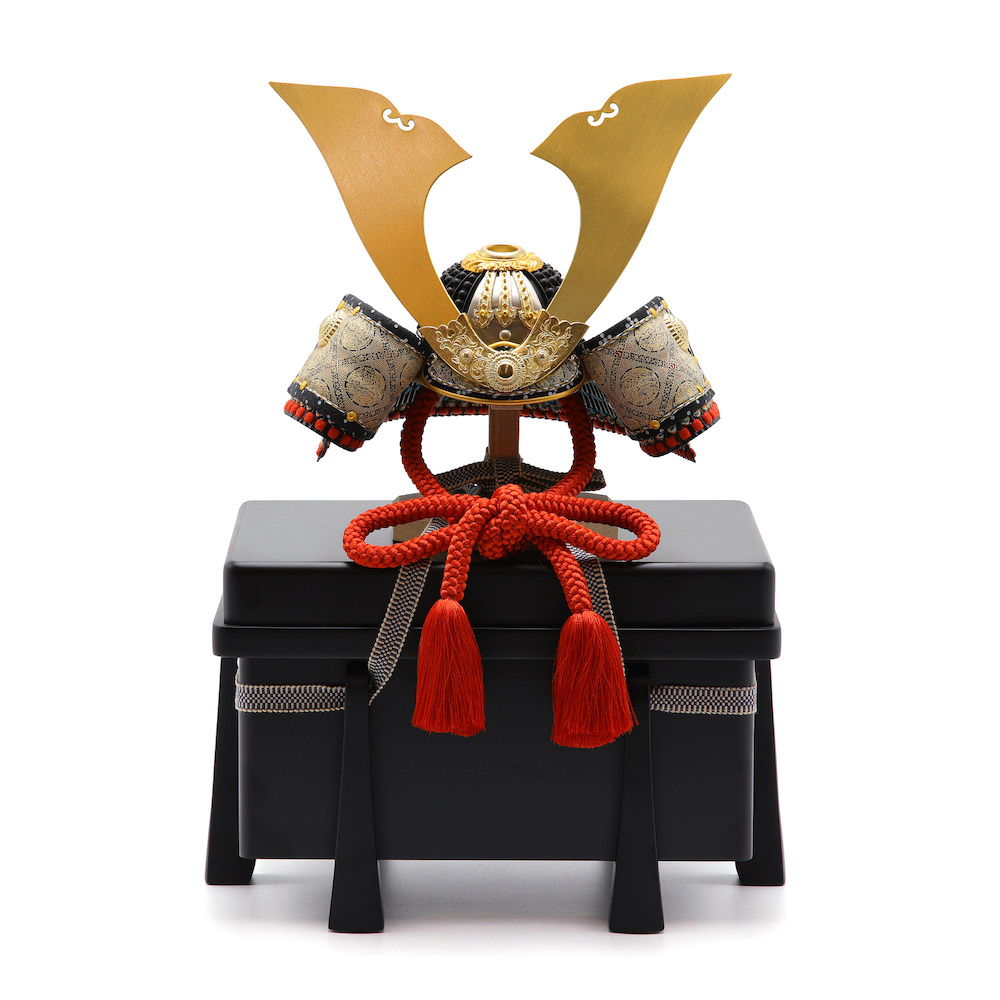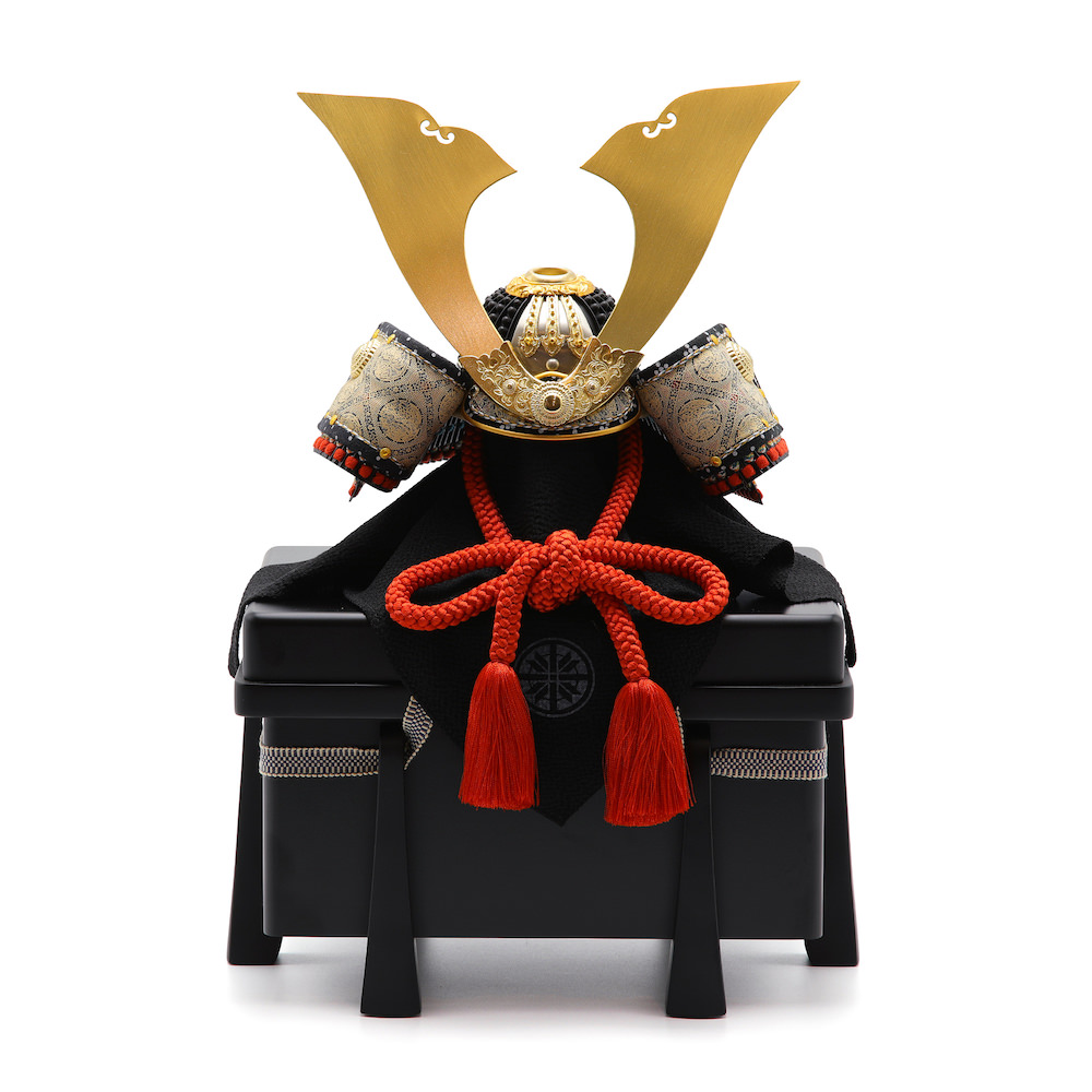 現代の住宅にも飾りやすく工房で企画したオリジナルの黒櫃は光沢を可能な限りなくし、マットな落ち着いた雰囲気が特徴的な木製の品。シンプルながら兜飾りの存在感が際立つこだわりの逸品です。