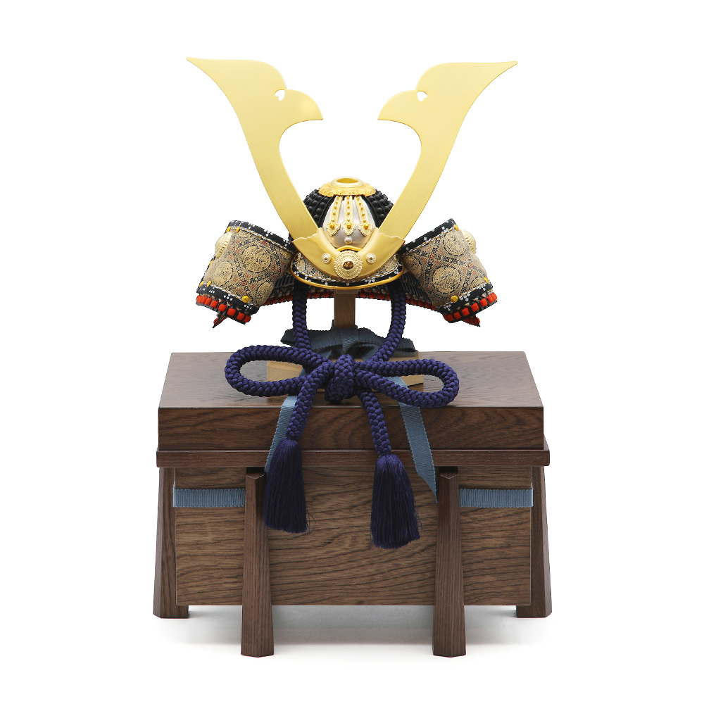 現代の住宅にも飾りやすく工房で企画したオリジナルの木製の櫃は木目のあたたかみとウォルナットの様な高級感と重厚感ある雰囲気が特徴的な木製の品。シンプルながら兜飾りの存在感が際立つこだわりの逸品です。兜の芯木を櫃に縛る真田紐は日本の古来からの色である縹色(はなだいろ)。真田紐の縹色が大変お洒落な差し色になっています。また、櫃の中には兜を収納することが可能です。