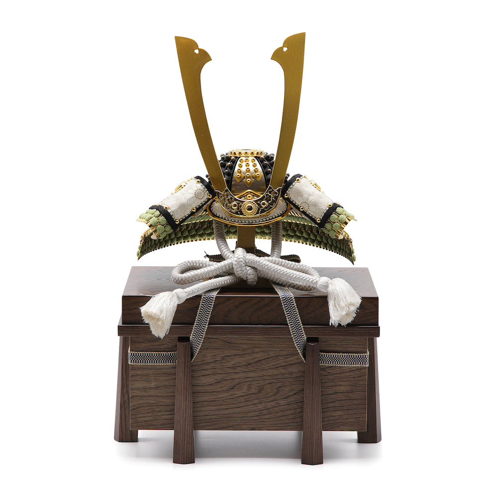 島根県にある日御碕神社(ひのみさきじんじゃ)に源頼朝が奉納したと言われる鎌倉時代の白糸威鎧をモデルに工房真と国内の甲冑師にて製作を致しました。威は名前の通り、鶯色をメインに白色と二色で明るく仕上げ、現代的な印象に仕上げました。