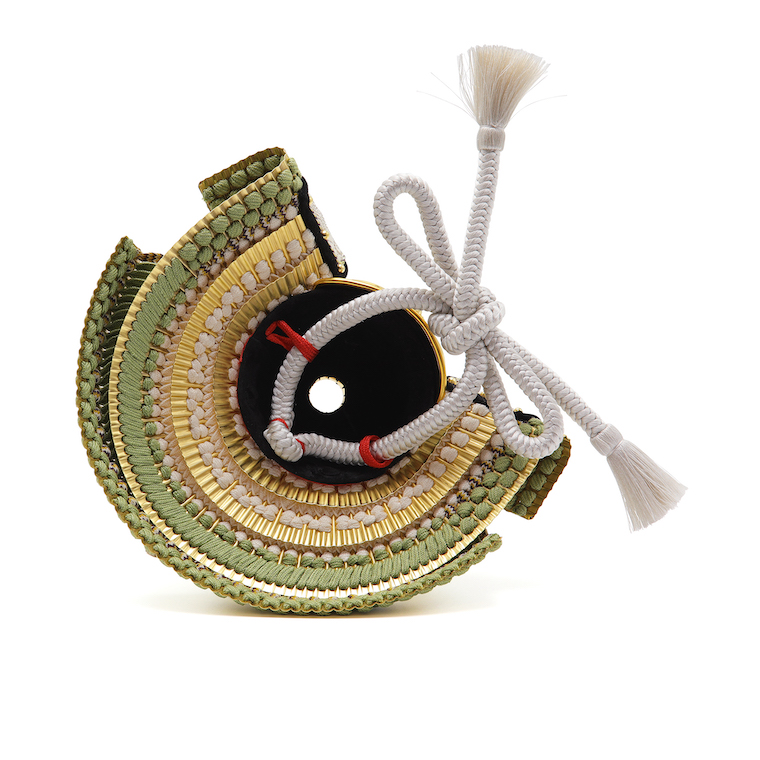 島根県にある日御碕神社(ひのみさきじんじゃ)に源頼朝が奉納したと言われる鎌倉時代の白糸威鎧をモデルに工房真と国内の甲冑師にて製作を致しました。威は名前の通り、鶯色をメインに白色と二色で明るく仕上げ、現代的な印象に仕上げました。