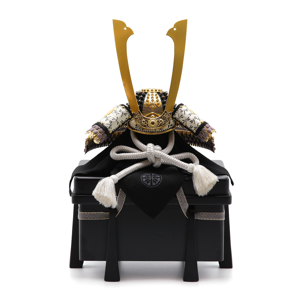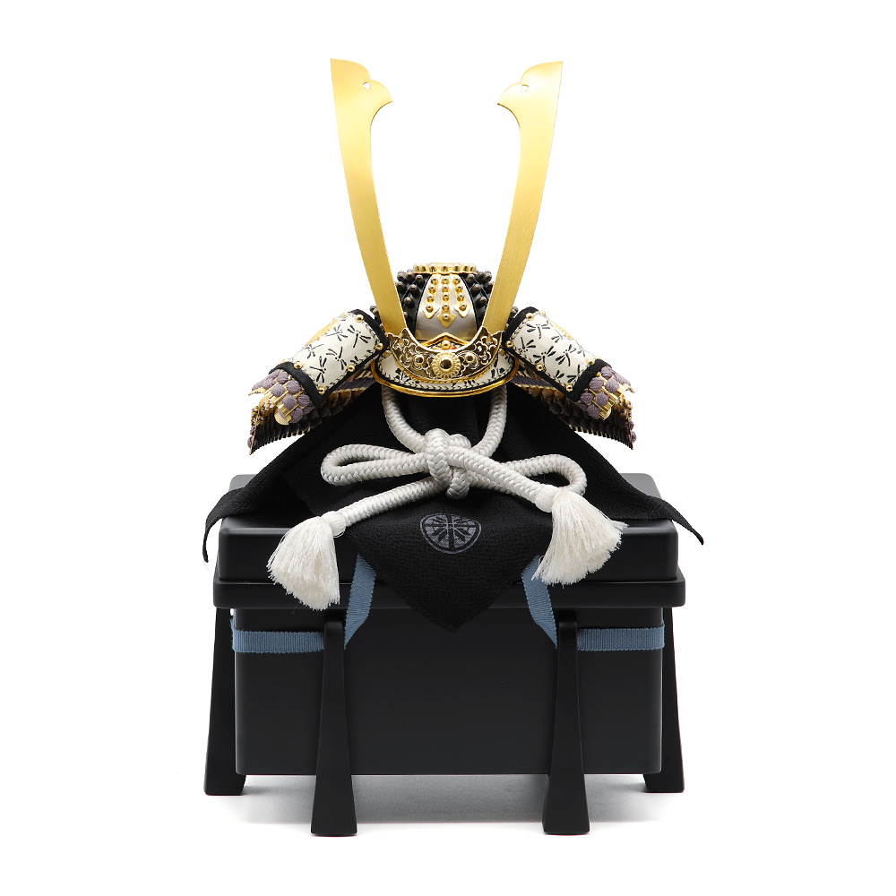 現代の住宅にも飾りやすく工房で企画したオリジナルの黒櫃は光沢を可能な限りなくし、マットな落ち着いた雰囲気が特徴的な木製の品。シンプルながら兜飾りの存在感が際立つこだわりの逸品です。