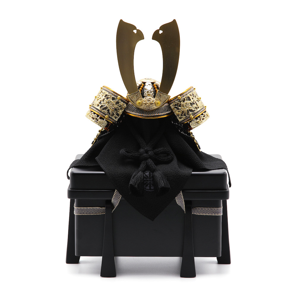 現代の住宅にも飾りやすく工房で企画したオリジナルの黒櫃は光沢を可能な限りなくし、マットな落ち着いた雰囲気が特徴的な木製の品。シンプルながら兜飾りの存在感が際立つこだわりの逸品です。