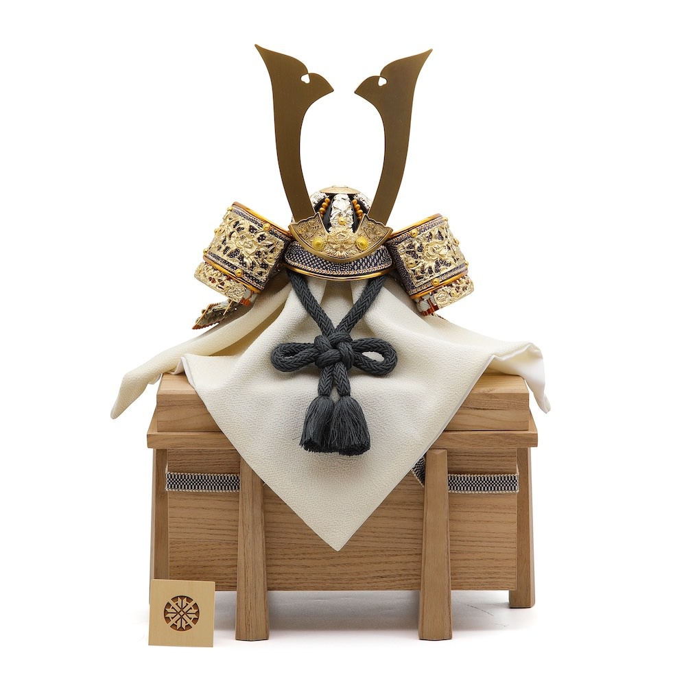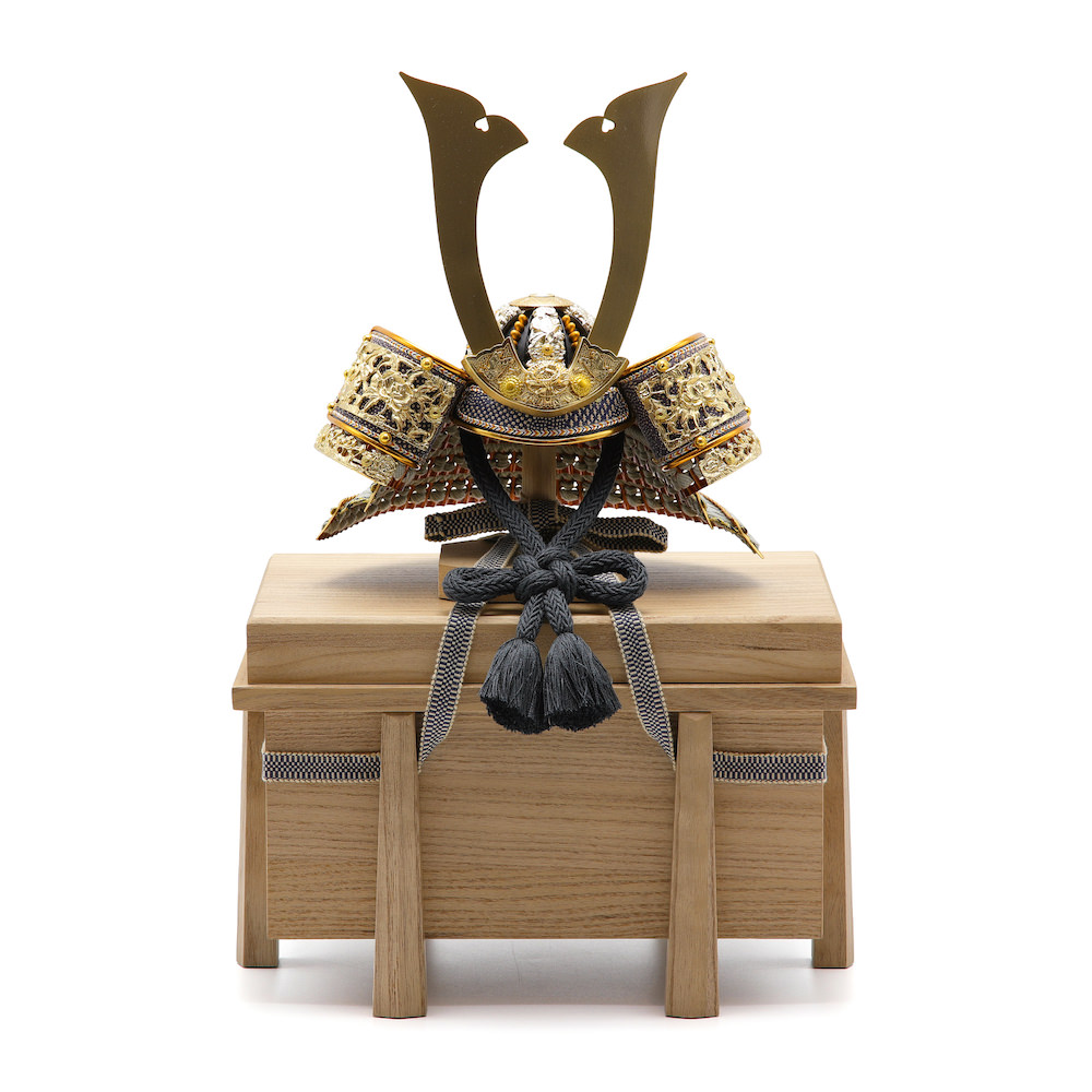 繊細なお色の青みがかった薄灰色の威に豪華な装飾の長鍬兜。日本の職人の技術をふんだんに織り交ぜた確かな品質のコンパクトで飾りやすいサイズの豪華な兜飾りです。シンプルな木目の桐製の櫃にセットした飾りです。兜はお櫃の中に収納することが可能となるため、洗練されたスタイリッシュさと機能性を兼ね備えています。