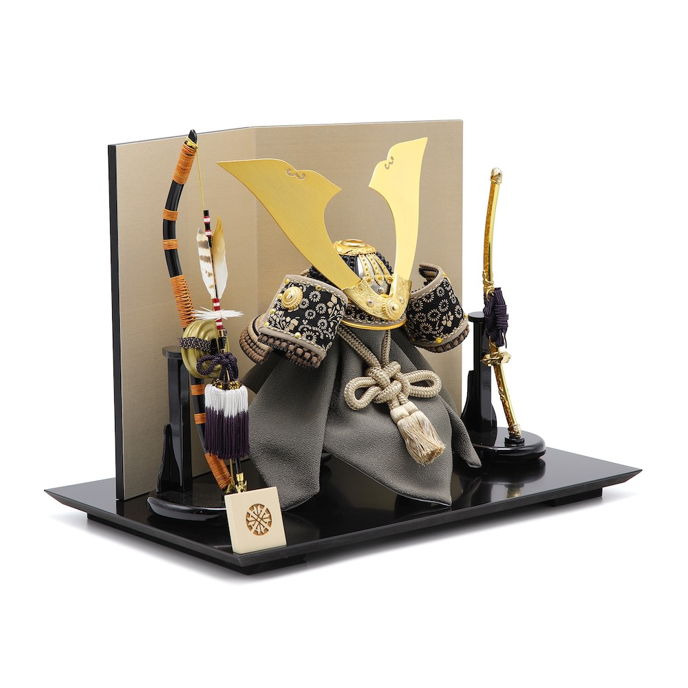 兜の両隣に弓太刀を添えました。黒塗りに橙色が差し色の工房真の兜向けに製作したオリジナルの品です。豪華でお洒落な兜を主役にしたモダンさを感じつつも、こだわりの品を集めて仕上げた迫力ある飾りです。