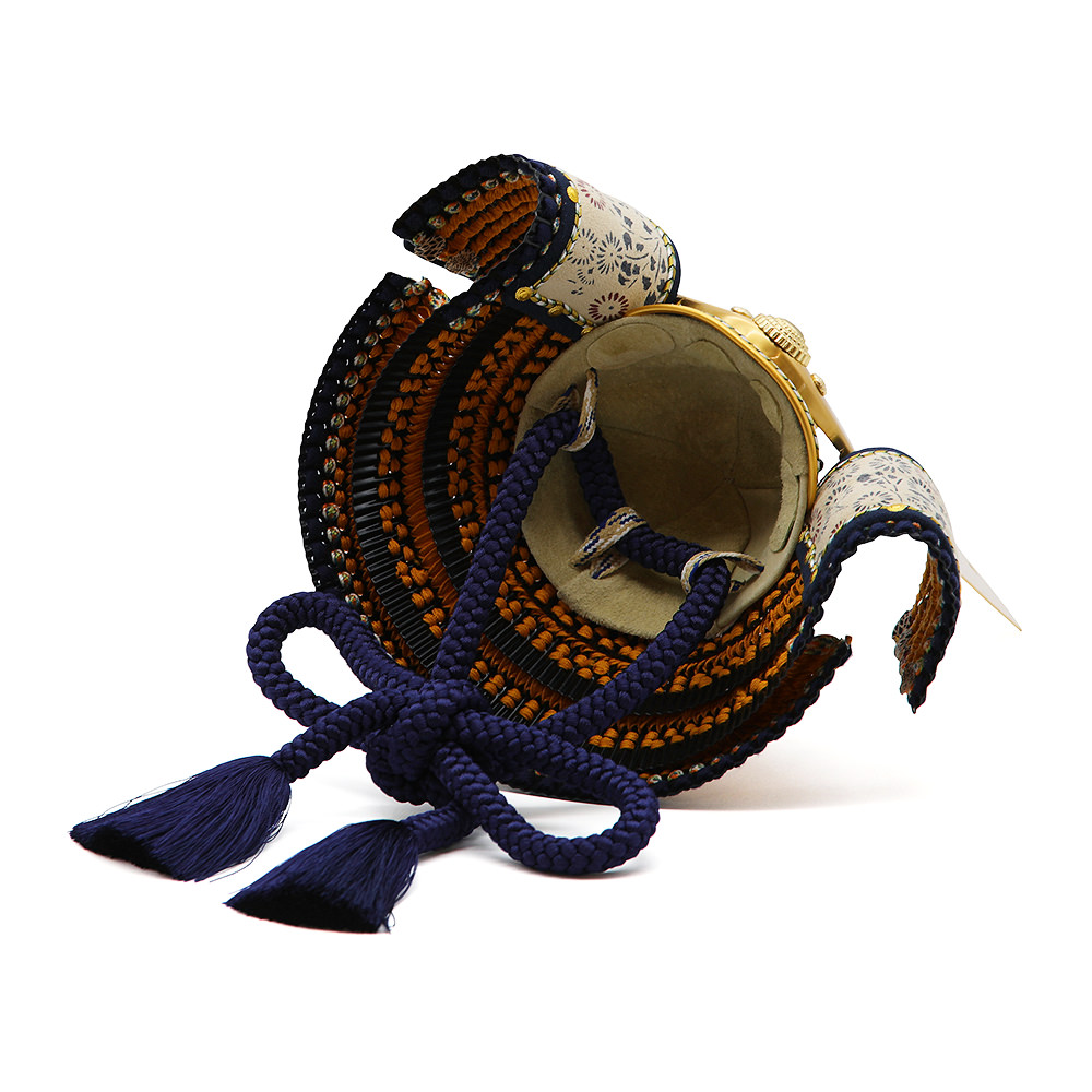 工房真と国内の甲冑師にて製作したこだわりの山吹糸威の兜飾りです。威は名前の通り、山吹色をメインに部分的に紺色を用いて、存在感のある兜に仕上げています。細かい3mm間隔での編み込み、一般的にはコンパクトサイズながらも五段の錣(しころ)は、職人の手間と技術が込められている証です。一つひとつの兜は職人の手作り品のため、非常に細かな違いがございますが、お客様のために製作された世界に一つの兜飾りです。