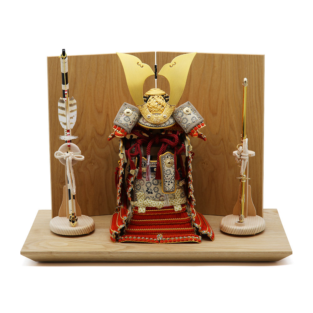 飾り台と屏風はタモの木で制作した木目が大変美しい国産品。屏風と飾り台の組み合わせがシンプルで大変スタイリッシュです。統一感があり、鎧兜の存在が際立つスタイリッシュな品です。